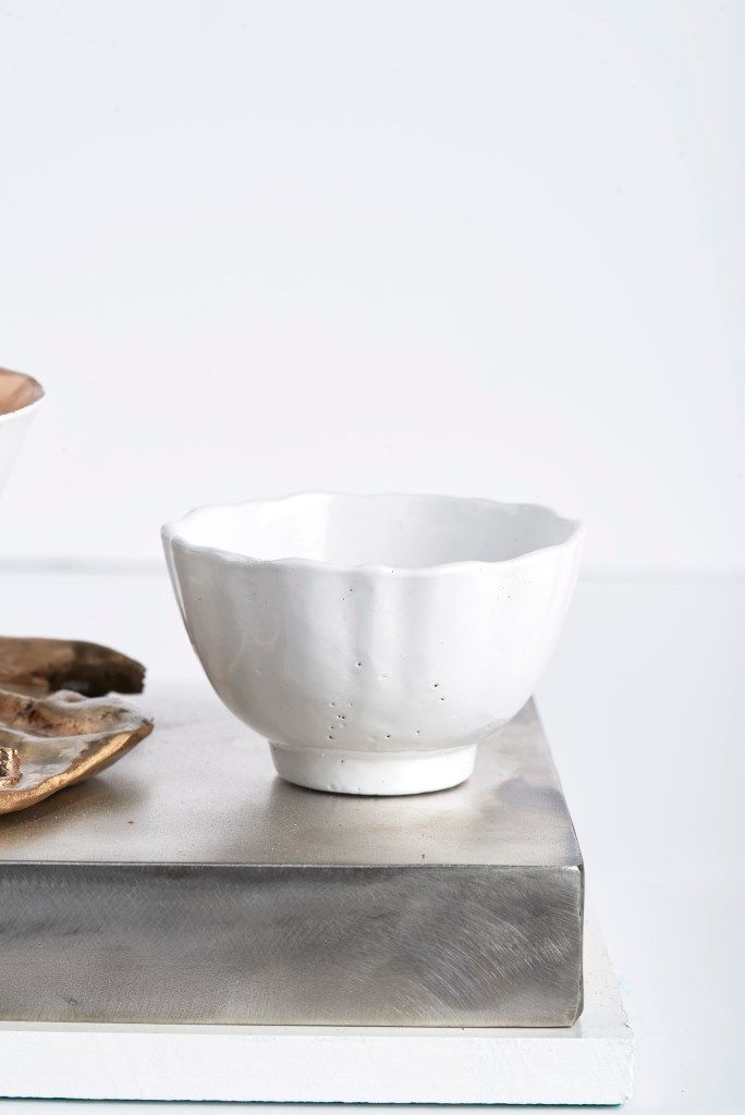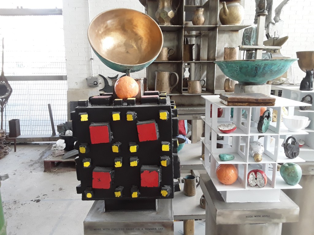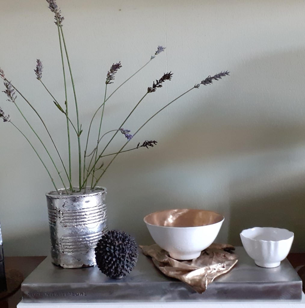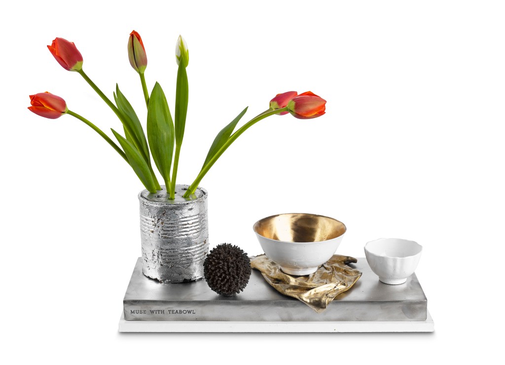 The muse is depicted as a white rice bowl whilst her husband (the sculptor) is depicted as a smaller less consequential tea bowl. The muse is also represented by the seed head of a globe thistle and a tin can that has been repurposed into a vase for flowers. The combination of a love of the natural world and an informal and unpretentious approach to life sum the muse up.