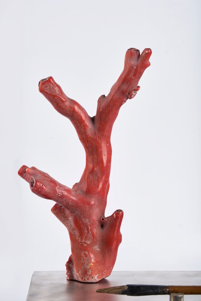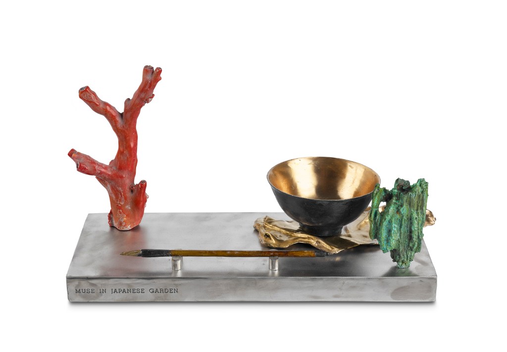 The muse is depicted as a black rice bowl. I have tried to emphasise her Japanese connection and indeed her aesthetic. The garden contains a scholar’s brush, a moss covered rock and the stump of a tree which I hope resembles Japanese lacquer ware. In reality the stump is a piece of antique Italian red coral to denote the muse’s love of Italy.