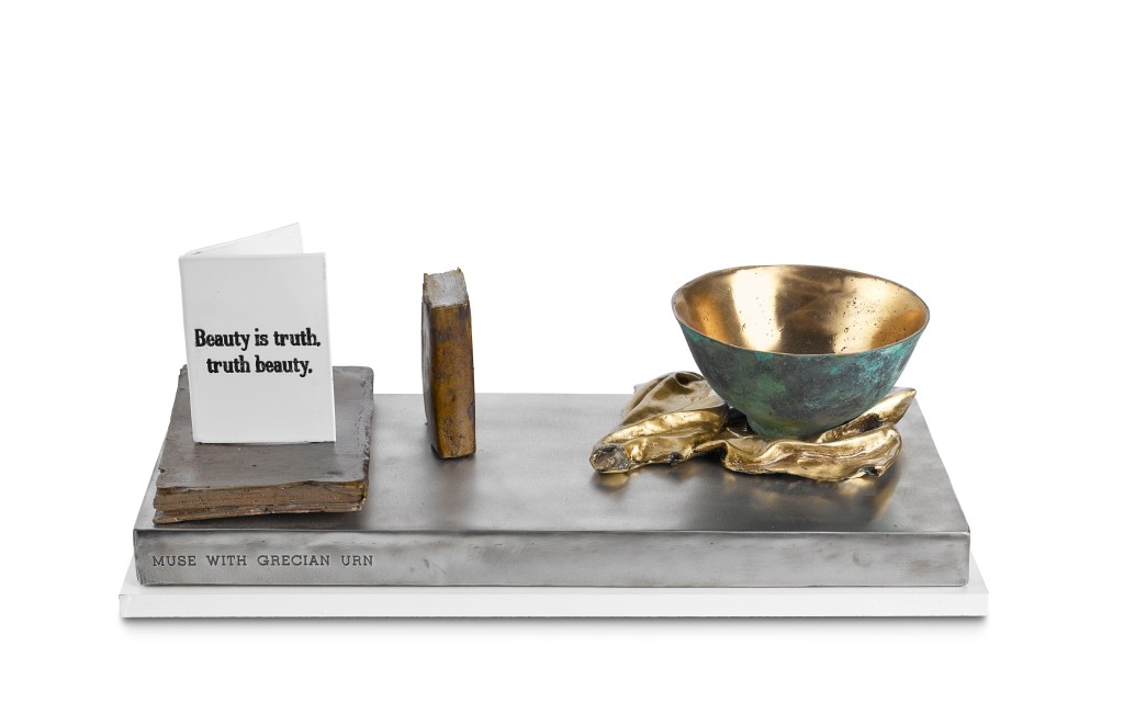 The muse is depicted as a rice bowl with an antique green patina. Around her are the tools of her trade, books. The muse abounds with knowledge but more so with wit and fun. I have called the piece Muse with Grecian Urn but the urn itself is invisible. Instead are the famous lines from Keats’s ode. They seem to be the most important lines about art ever written.