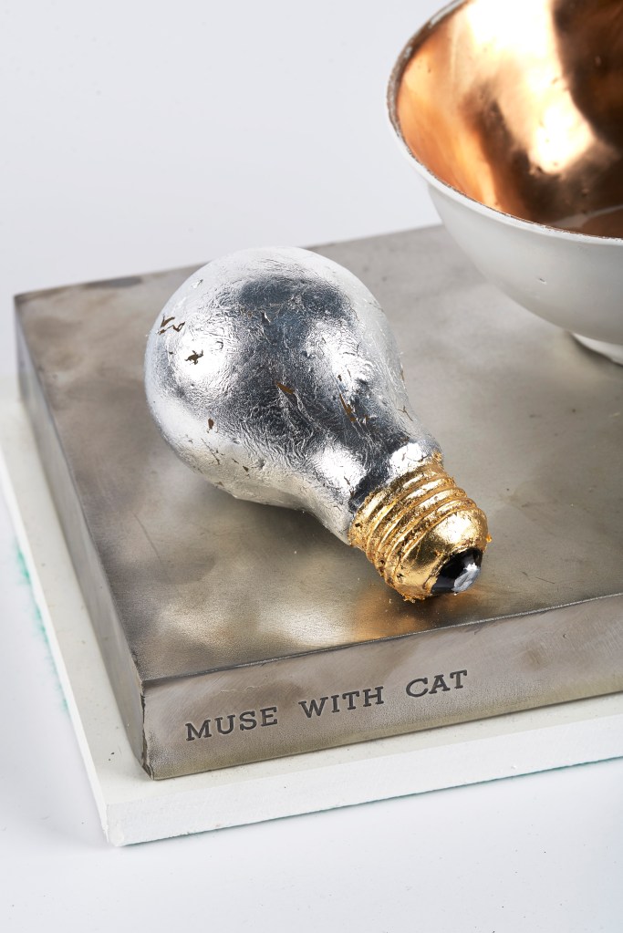 The muse is depicted as a white rice bowl to symbolise her elegance and wonderfully ethereal quality. Round about her I have placed a cat (perhaps called Sooty?) And a light bulb. The bulb symbolises the muse’s ability to light up a room with her very presence.