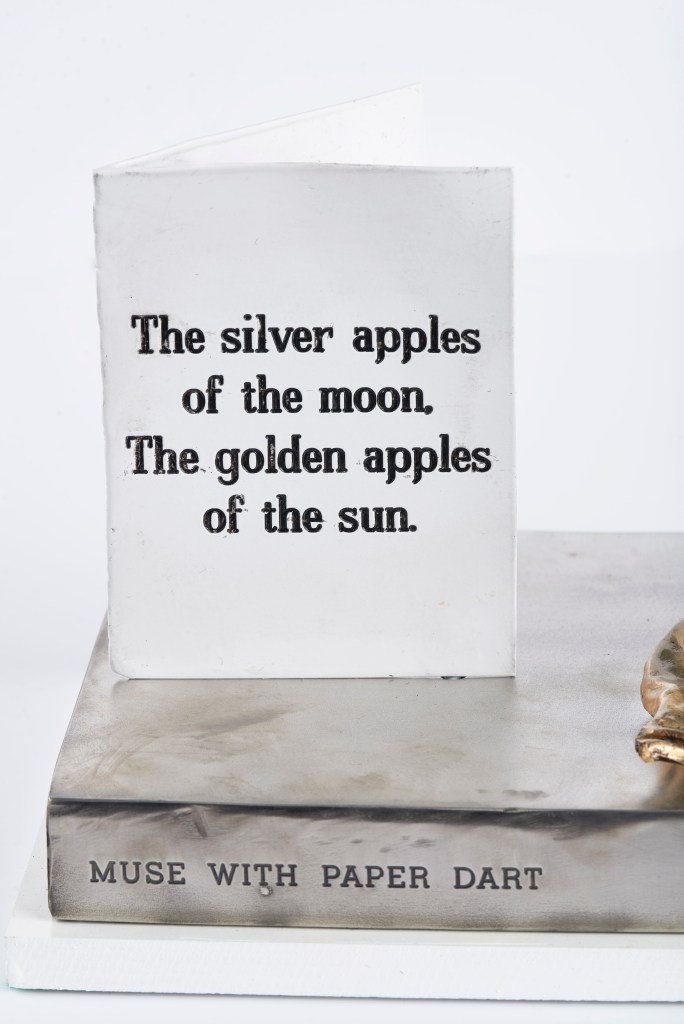 The muse is depicted as a green rice bowl to depict nature. I wanted an image to convey not only the muse’s grasp of the creative process but also her understanding of how frail the paper darts are that carry artist’s dreams. The quote is from WB Yeats’s ‘The Song of Wandering Aengus’. There are few poems that describe how artists mutate images until with the light of dawn the fish/woman fades and is seen to be an illusion. Most artist seem obsessed with rediscovering in tangible form fragments of their imagination – the glimmering girl with apple blossom in her hair.