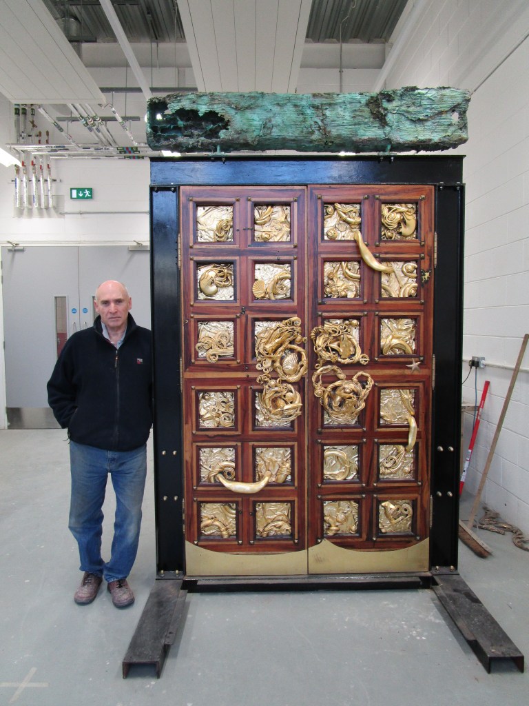 The original notion was that the sculpture was a doorway that links a secular world to a spiritual world. The doorway is a basic grid shape with the recessed spaces filled with bronze panels of fish and other marine creatures. The image of the fish was an early symbol for Christ and my depiction of a multitude of fish is an acknowledgement of divinity in all of us. The wooden grid is overwhelmed by the fish spilling out from the door. Liminal events like doors imply the spaces they are linking but I have never quite known what is on either side of the doors. So I feel I need to make something to describe these spaces. But what? Maybe though there is not a progression of spaces. Maybe the doors are simply an event. Maybe all I need to do is cover a floor with shingle from a beach? Shingle that has drifted in places so the floor is irregular? Maybe the footsteps in the shingle are integral to the sculpture….Umm…