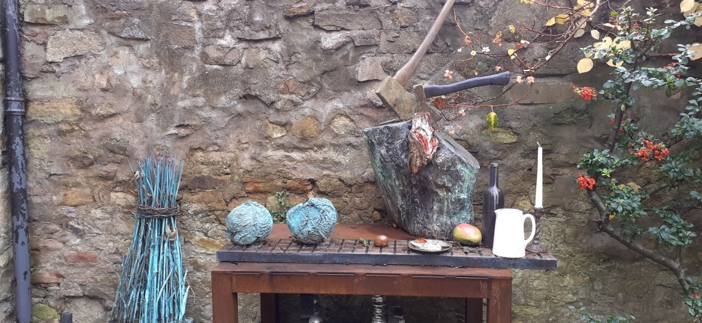 In the case of this garden there is a synergy between the sculptures and nature in that the themes of the sculpture are about abundance and life and death and the constant battles between animals or plants for their very survival. All of the sculptures in their way are about the matrix between us but mostly so in the Bird Table where we can actively participate in the magic of flight from a kitchen window.